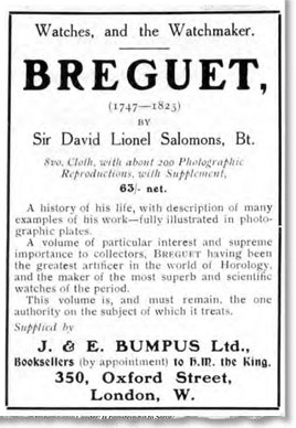 Until now we have no publication relating to the work of Breguet…There will however, shortly be published a work entitled simply “Breguet (1747–1823),” in which the author gives 115 plates of reproductions of the master's work with technical notices, indications by which the pieces can be identified and a summary of what is known of Breguet. This publication we owe to an Englishman, a great friend of horology, an admirer of Breguet, who has gathered the most remarkable collections of his productions in existence, Sir David Salomons…The homage he [Salomons] is about to tender to Breguet is, moreover, more elaborate than any one in France has any idea of.