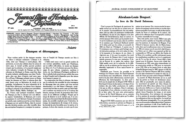 Léopold Reverchon (1869–1943) pens a touching review of David Salomons' Breguet book in the September 1922 Journal suisse d'horlogerie et de bijouterie entitled “Abraham-Louis Breguet. Le livere de Sir David Salomons.