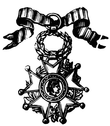 Note: The decoration of the royal order of the Legion of Honor consists of a star with five double rays, surmounted by the royal crown. The center of the star, surrounded by a wreath of oak and laurel, presents, on one side, the effigy of Henri IV with this exergue, Henri IV, King of France and Navarre and on the other; three fleur-de-lis with this exergue, Honor and Country. Chevalier wear the silver decoration on one of the buttonholes of their coat, attached by a red moiré ribbon