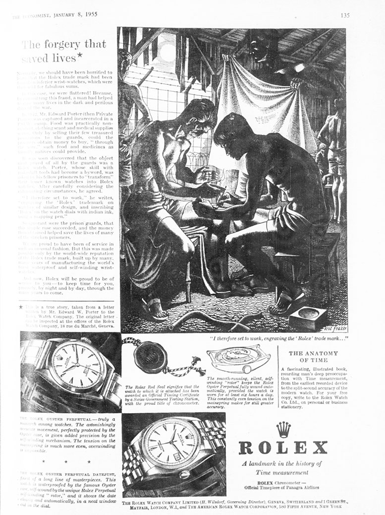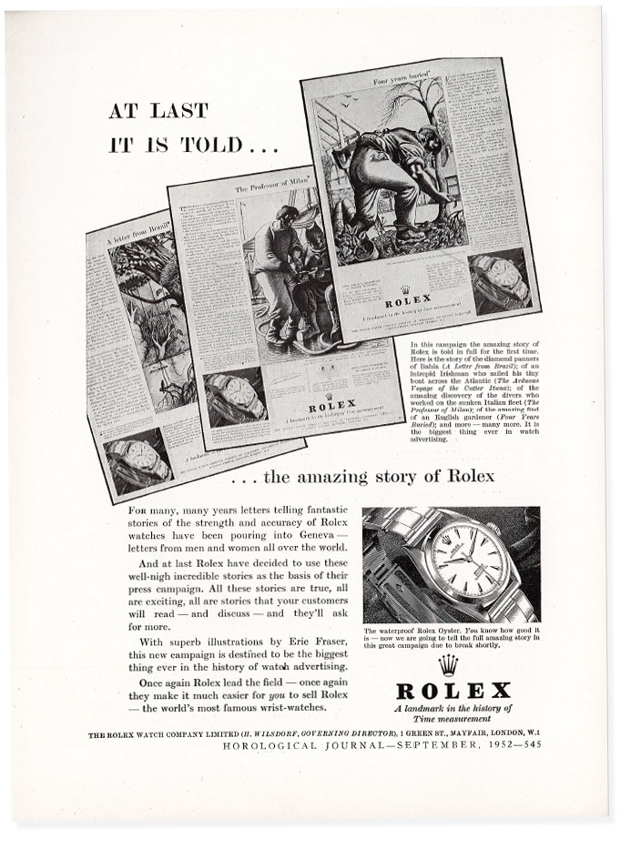 Nineteen fifty-two saw the launch of a superb [advertising] campaign…For many many years letters telling fantastic stories of the strength and accuracy of Rolex watches have been pouring into Geneva…With superb illustrations by Eric Fraser, this new campaign is destined to be the biggest thing ever in the history of watch advertising. the rolex oyster: 39 years of advertising history: j. walter thompson agency