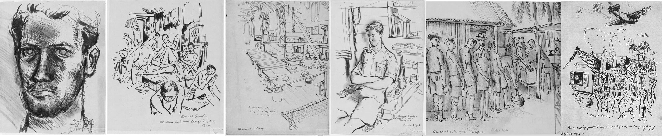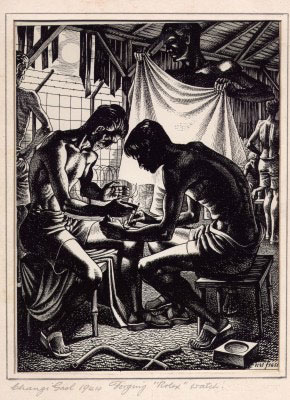 Ronald Searle (1920–2011) the British illustrator spent 16 months at Changi Gaol where he befriended Edward Porter; Searle's Changi Gaol sketches chronicle the stark life in the Japanese prison camp…note the far-left picture is a self-portrait while imprisoned by the Japanese. Ronald Searle like Eric Fraser did illustrations for Radio Times and likely knew each other as both were well-known illustrators in 20th century Britain.