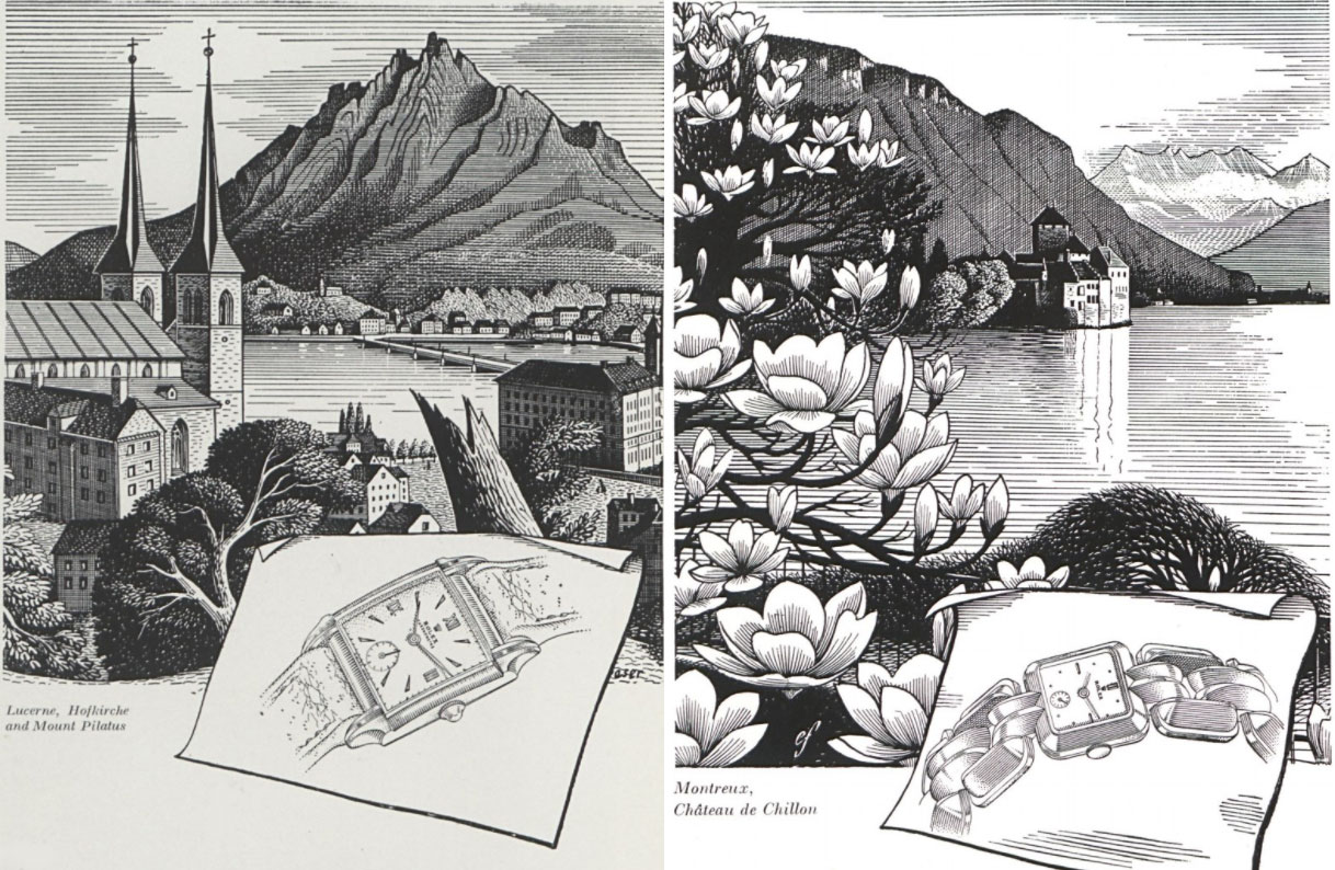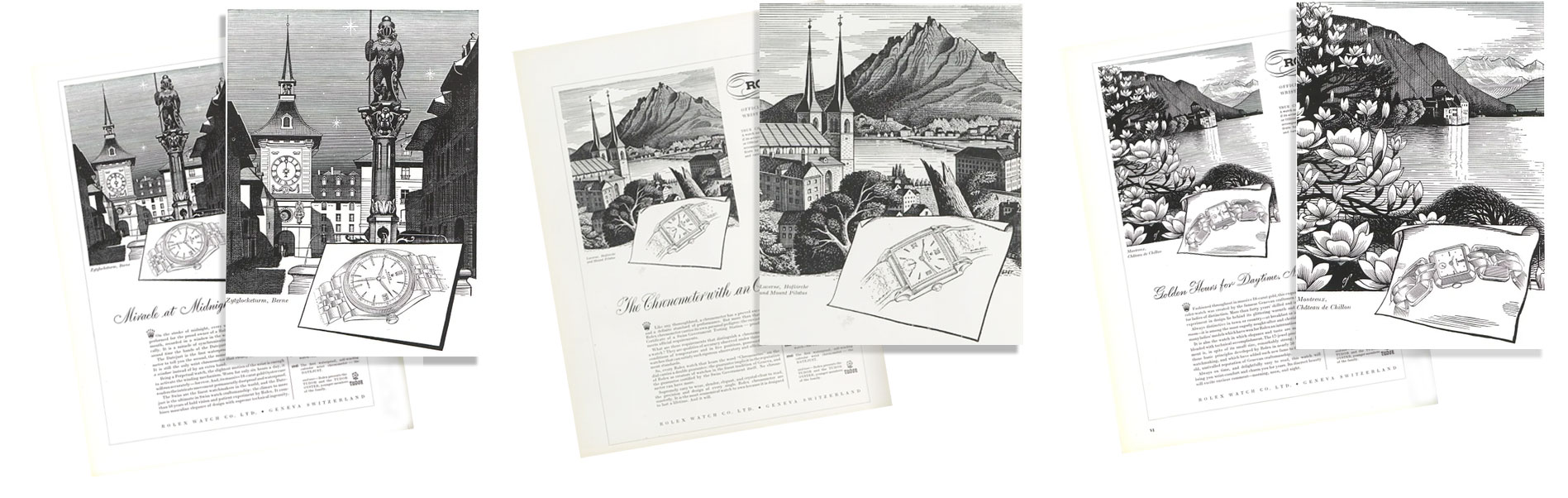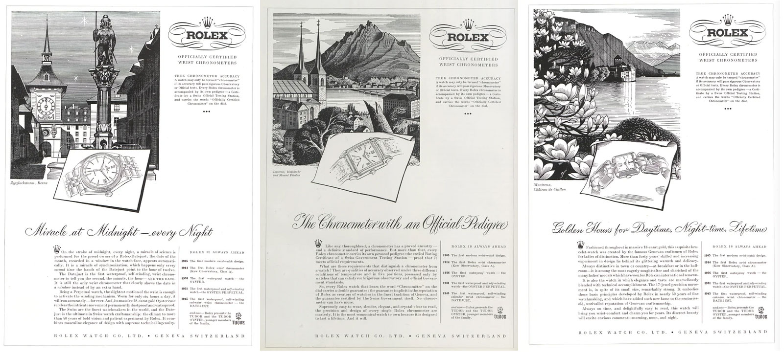 In 1947 J. Walter Thompson introduced its inaugural Rolex advertising campaign with fine line drawings of Swiss city & landscape scenes along with a list of Rolex firsts such as 1st waterproof watch etc. and also mentioning the introduction of the Tudor and the Tudor Oyster: younger members of the family. Three of these advertisements (Miracle at Midnight—every Night, The Chronometer with an Official Pedigree & Golden hours for Daytime, Night-time, Lifetime) appeared in Graphis Magazine (1948) Nos. 23, 24 and 25 featuring Zytglocketurm, Berne & Lucerne, Hofkirche, Mount Pilatus and Montreux, Château de Chiillon—other Swiss scenes included: The Hospice du St. Gothard, San Martino Church at Olivone & Adelboden, Switzerland. (Note: Eric Fraser did the illustrations for the 1947 inaugural campaign—maybe the prettiest Rolex adverstisements—please see appendix c).