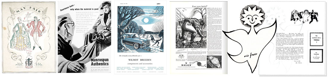 Eric Fraser illustrated advertisements across a wide-range of industries and products, e.g. MayFair Hotel, Munrospun Scottish Tweeds and Wilmont Breeden automotive accessories—Eric Fraser illustrated ≈ 20 Rolex advertisements in the early 1950s. Eric Fraser created Mr. Therm for British Gas in 1932; Mr. Therm remained the industry's mascot for 30 years.