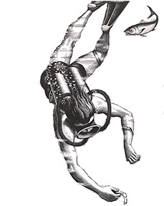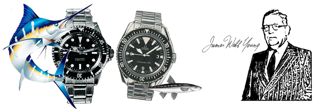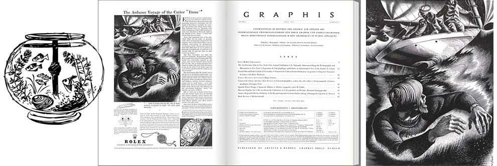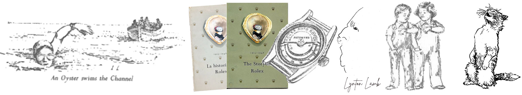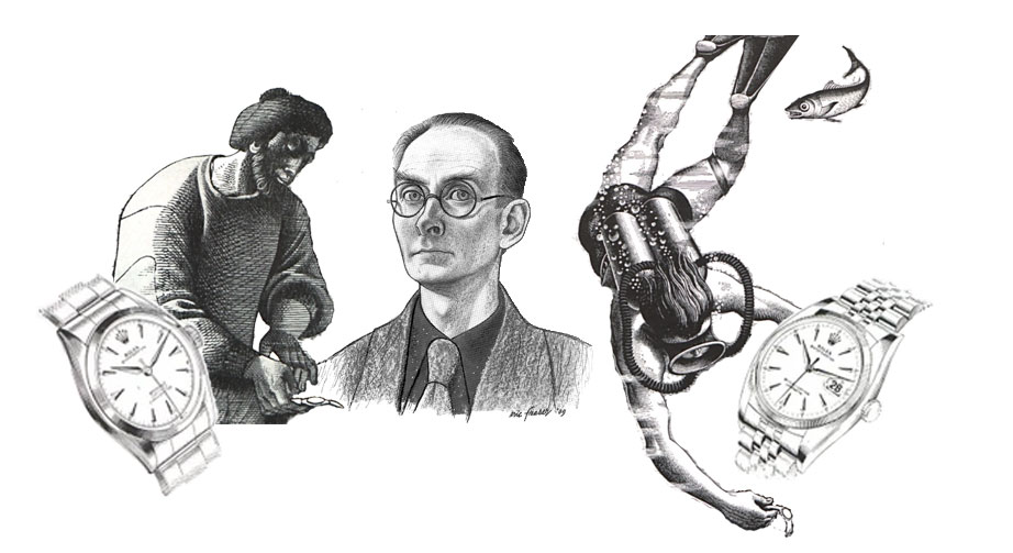 The 1950s long copy campaign JWT mentions (see quote) consisted of many advertisements (eight of the advertisements appeared in Graphis Magazine 1949–1951)—each advertisement displayed a vignette “by” Hans Wilsdorf e.g. The watch that swam the English Channel by Hans Wilsdorf. Though the artwork is sans signature most likely the artist is the Swiss graphic-designer Hans Tomamichel (1899–1984)—Hans Tomamichel illustrated the 1945 Rolex Jubilee Vade-Mecum and was the creator of Knorrli, one of the most-recognizable figures in Swiss advertising.