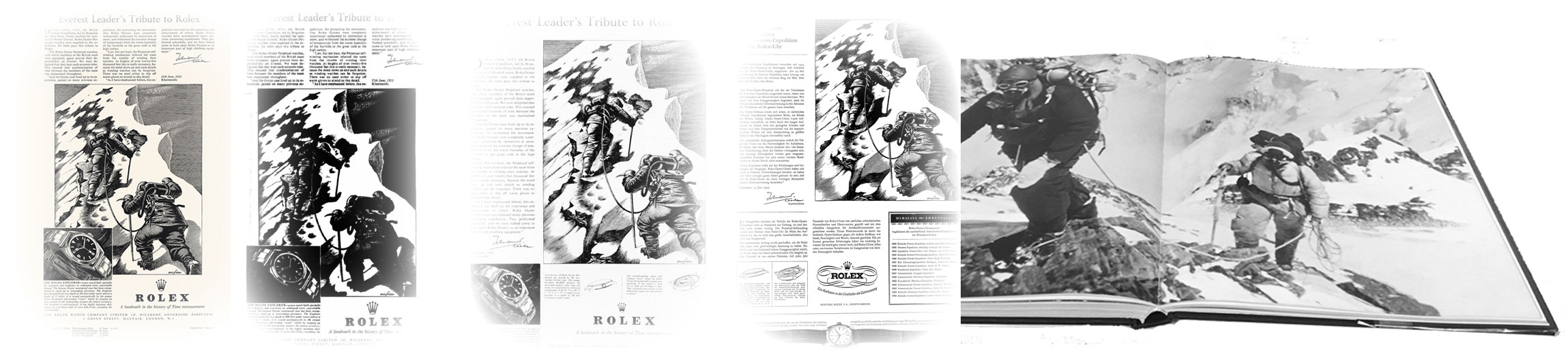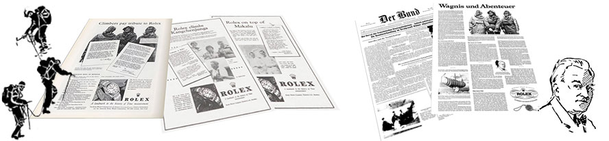 The J. Walter Thompson Agency in addition to serial-advertising-campaigns celebrated important occasions, i.e. acknowledging Rolex's alpine feats: “Tributes” for the Everest, Kangchenjunga & Makalu climbing expeditions and in 1956 the 75th anniversary of Hans Wilsdorf's birthday—Hans Wilsdorf was born March 22, 1881 and the full-page 75th anniversary notice appeared in the March 22, 1956 Bern (Swiss German-language) newspaper Der Bund under the heading: Wagnis und Abenteuer.