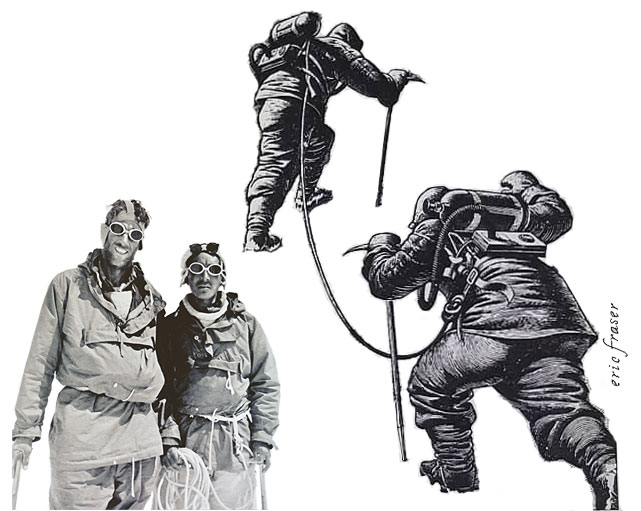 Eric Fraser's only mountain-climbing illustration prior to the “Everest Leader's Tribute to Rolex” was the illustration for Radio Times' radio adaptation of Joanna Cannan's 1931 psychological thriller Ithuriel's Hour—the book concerns the fictional 27,000 ft. Chowo-Kangi (Himalayas) which plays the roll of Mt Everest. The illustration appears in the June 30th, 1939 Radio Times program guide (lower-right).