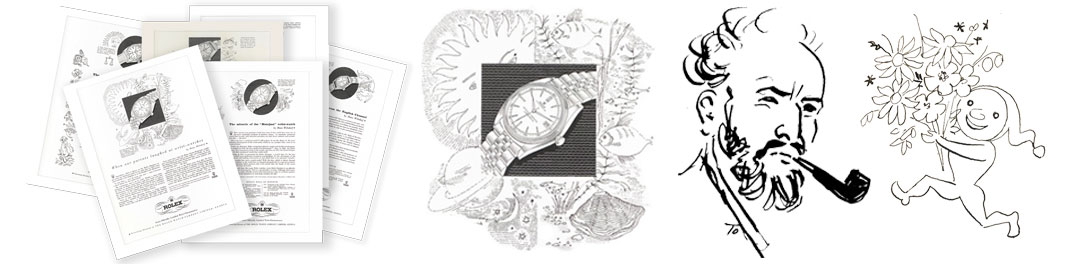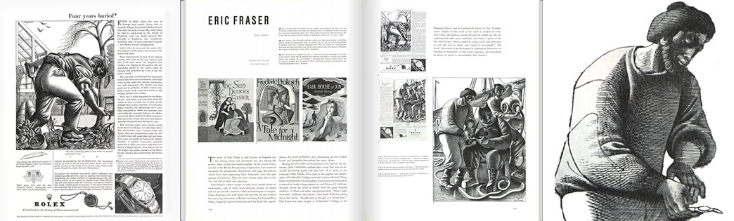 His [Fraser] advertisement art is creative…The [advertiser] must be allowed the choice of subjects to be depicted…but if Fraser draws them he makes them his own (Alec Davis)…These comments aptly summarize Fraser's strengths when it comes to the promotion of a product or service, for example in his drawings for the Rolex watch company (Wendy Coates-Smith)… eric fraser: designer & illustrator—sylvia backemeyer, lund humphries, 1998 (pg. 24–25)