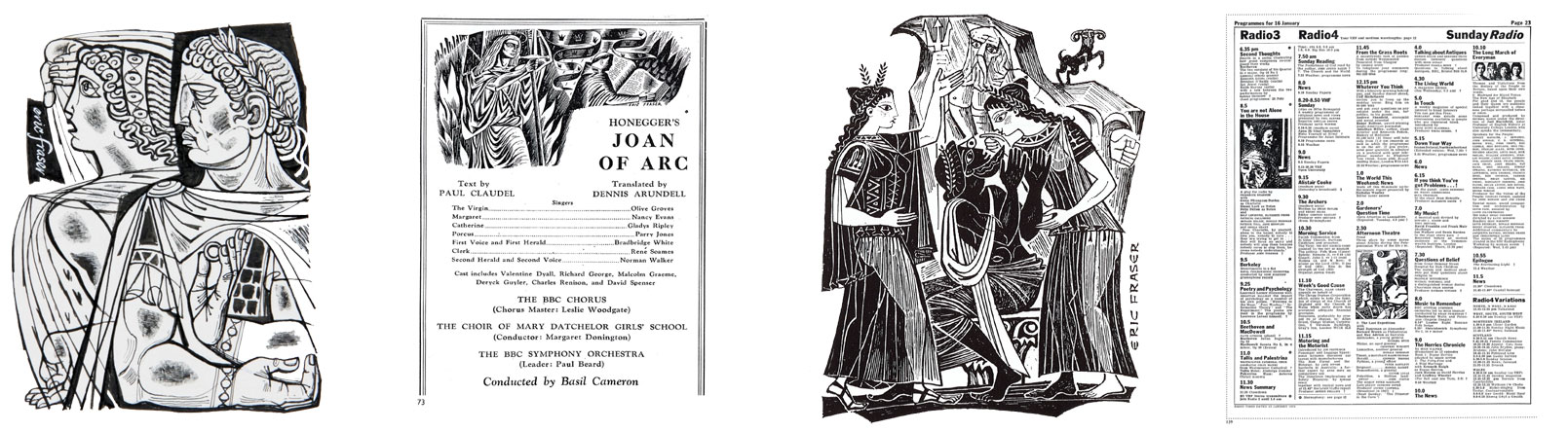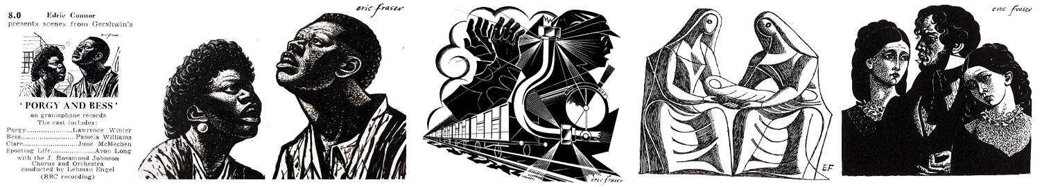 Eric Fraser is most publicly-known for the illustrations made for the BBC Radio Times programme-guide: Gershwin's Porgy and Bess (1959), Ewan MacColl's The Ballad of John Axon (1958), Two Mothers (1961) and The Brother Karamazov (1957)—Eric Fraser began drawing for Radio Times in 1926 and Fraser's drawings would appear in the programme-guide for the next 50 years.