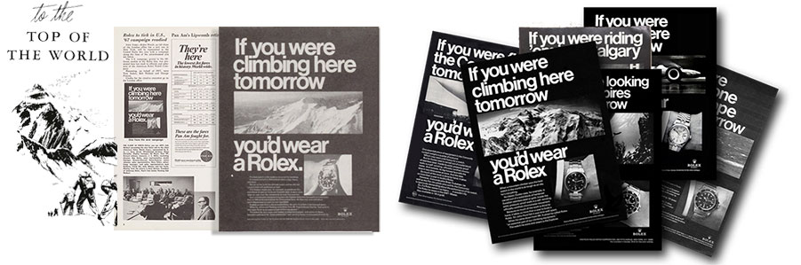 The January 27, 1967 JWT internal newsletter announces: “Rolex to tick U.S., '67 campaign readied”—the fecund campaign is the If you were climbing, skiing, racing, sailing etc. you'd wear a Rolex campaign.