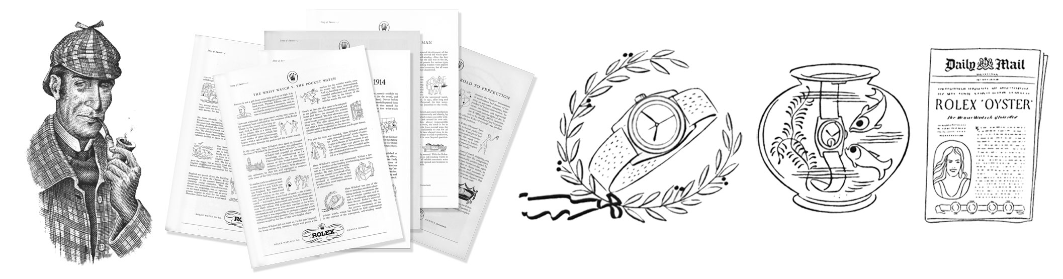 The “Story of Success” campaign consisted of six individual advertisements with titles such as: the wrist watch versus the pocket watch and the oyster and the waterproof watch. 51 unique line-drawings appeared in the campaign (7–9 illustrations per advertisement)—the artist is unknown to the author (possibly the Swiss illustrator Hans Tomamichel).