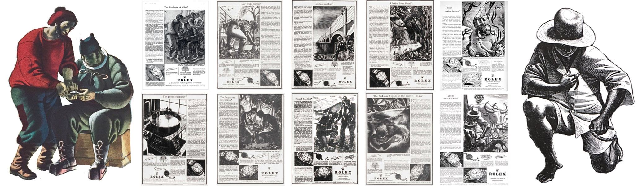 The article takes a look at the 1952 Rolex “Fantastic Stories” advertising campaign, the advertising agency responsible for creating the campaign (J. Walter Thompson) and the artist selected to illustrate the advertisements (Eric Fraser). Three individual “Fantastic Stories” will be highlighted: The Professor of Milan, 7 years under the sea… & The Arduous Voyage of the Cutter “Ituna”. Appendices look at Eric Fraser's illustration for the 1954 Everest Tribute to Rolex, Eric Fraser's illustrations for the 1947 Rolex “Swiss landscape” advertisements, The Oyster and the Cat—a Moral Fable and the Rolex advertisement: The forgery that saved lives.