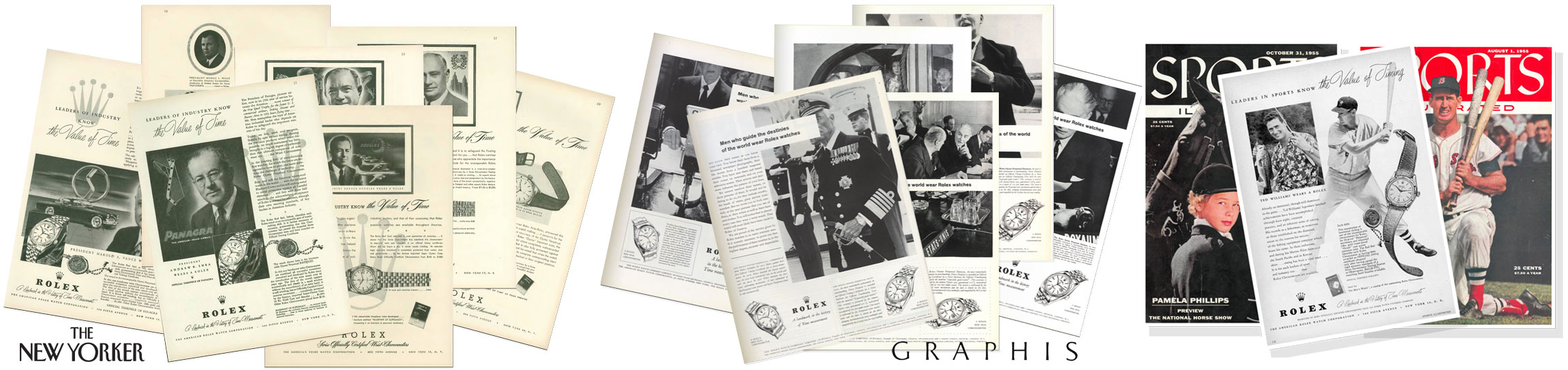 In the 1950s Rolex and J. Walter Thompson peppered magazines with two similarly-themed campaigns: Leaders of Industry Know the Value of Time (early 1950s, examples from New Yorker Magazine) and Men who guide the destinies of the world wear Rolex watches (late 1950s, examples from Graphis)—a twist on the Leaders of Industry—the Halloween issue of Sports Illustrated featured a Ted Williams Rolex advertisement with the tagline: Leaders in Sports Know the Value of Timing (odd the advertisement did not appear three months earlier when Ted Williams was on the cover of Sports Illustrated).