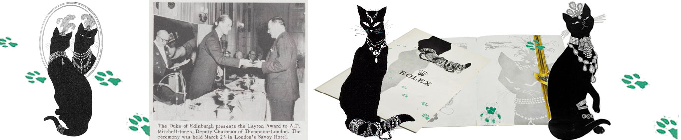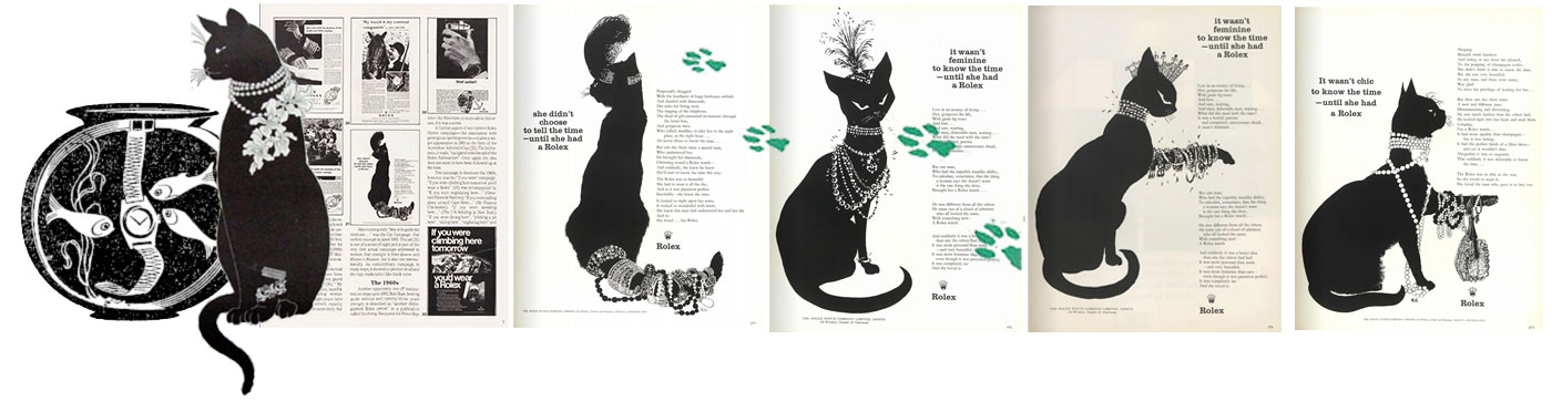 The Eastern Jeweller and Watchmaker No. 3-1963 (page 71–75) featured a 5-page section of the Rolex Cat Campaign entitled “The Oyster and the Cat—a Moral Fable”—accompanying seven of the advertisements was a publicity record of the qualities and faults of the campaign—QUALITIES: • sophisticated but likeable • the fine drawings, etc.; FAULTS: • risk of monotony with such a specialized theme • difficulty to find successor with equal presence etc. A longish poem of a fashion appears, no part of which appears in any of the Cat advertisements.
