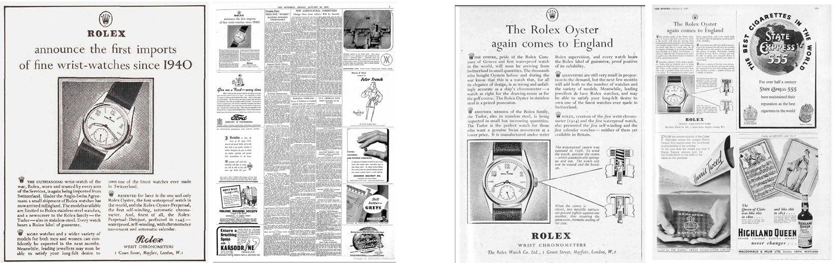 The 1947 Rolex advertisement mentioned below appeared in the January 10th, 1947 broadsheet The Scotsman (page 7)—JWT notes the advertisement is the “very first ad that appears in London's Rolex guard books”—a similar advertisement appeared in the March 8, 1947 The Sphere with the headline “The Rolex Oyster again comes to England“.