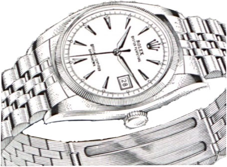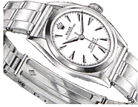 Beginning with the J. Walter Thompson era the quintessential rendering of the Rolex Oyster Perpetual appeared, gracing (in spades) Rolex advertisements between 1947–early 1960s—drawn in black & white and noted by distinctive shading the Oyster Perpetuals appeared in many dial and hands variations (the same aesthetic was applied to the Milgauss, GMT & Tudor Submariner). Though the artist is unknown to the author the watches suggest a single-hand given the manner in which the watches are illustrated—for now it's a mystery to the author. The Oyster illustrations are reminiscent (or rather vice versa) of the headline cut abbr. hedcut illustrations associated with the Wall Street Journal; e.g. Hermés Dressage L'Heure Masquée, Barbie™ and dog.